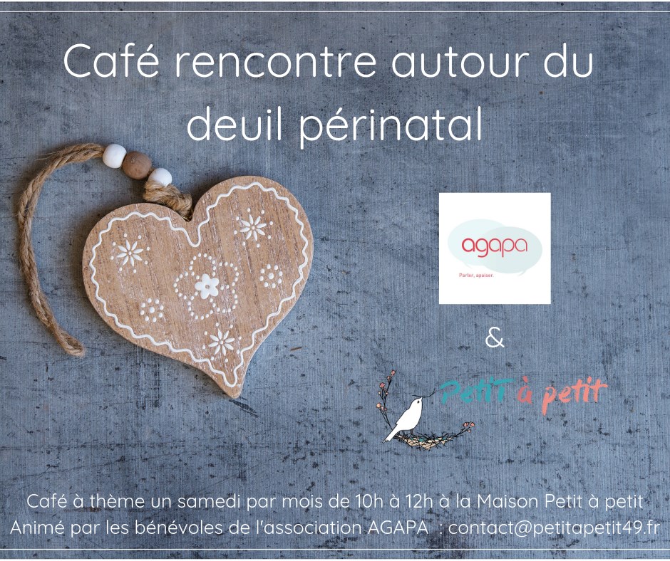 C’est au coeur de la Maison Petit à Petit à Angers que se déroulent désormais les cafés-rencontre animés par deux accompagnantes de l’association AGAPA. Ces rencontres sont destinés aux parents ayant vécu un deuil périnatal ou une interruption de grossesse, quelle qu’en soit la raison, et ressentant le besoin d’en parler avec d’autres parents. Ces rencontres sont gratuites.
