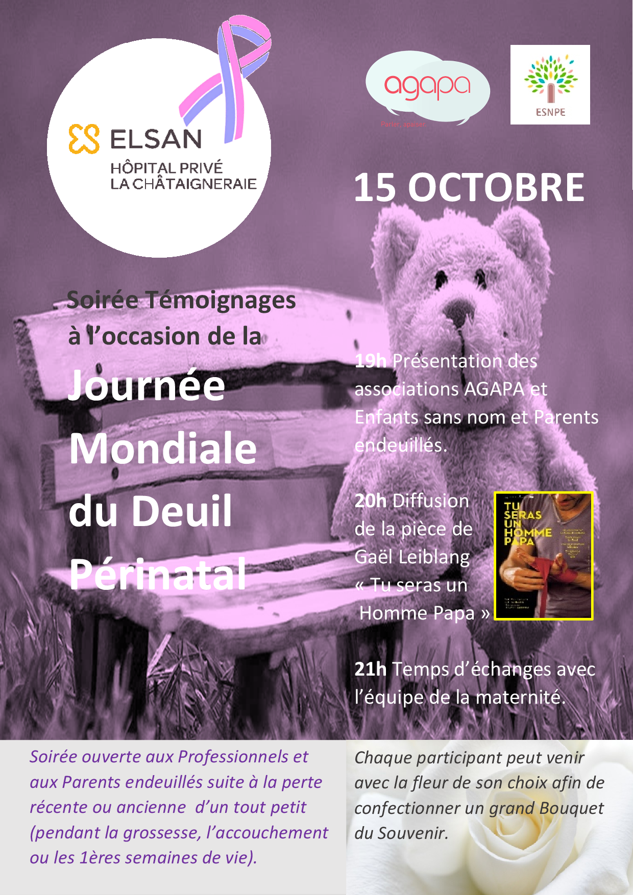 A l’occasion du 15 octobre, journée mondiale de sensibilisation au deuil périnatal, l’hôpital de la Châtaigneraie co-organise avec l’association Agapa et l‘association ESNPE, une soirée spéciale dédiée au deuil périnatal.