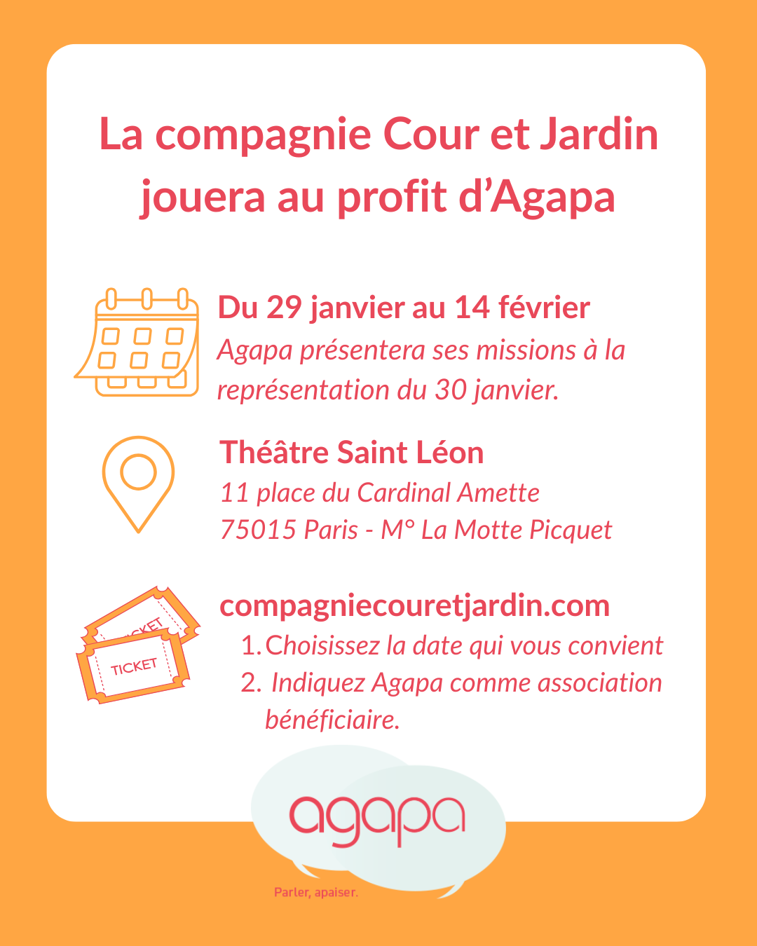 La compagnie Cour et Jardin jouera au profit d’Agapa du 29 janvier au 14 février 2026.